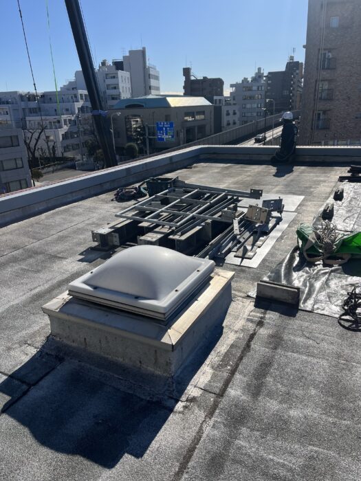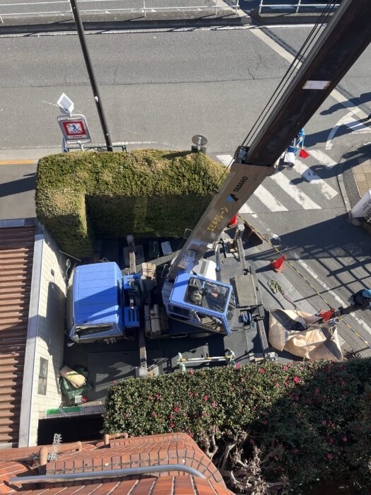 本日、携帯電話基地局撤去作業です。弊社ユニック班がお借りする場所の養生施工してからトラッククレーン進入設置致しました。弊社作業員が屋上に上がり無線合図、玉掛け作業行いました。作業は順調に進んで無事終わる事が出来ました。