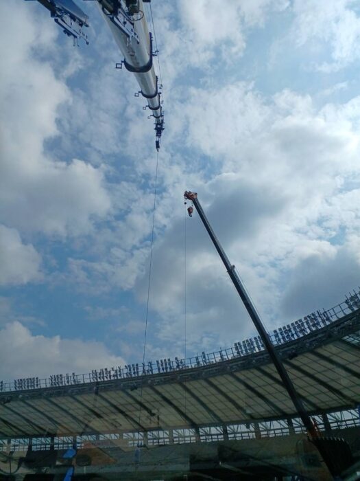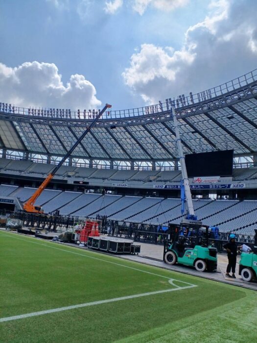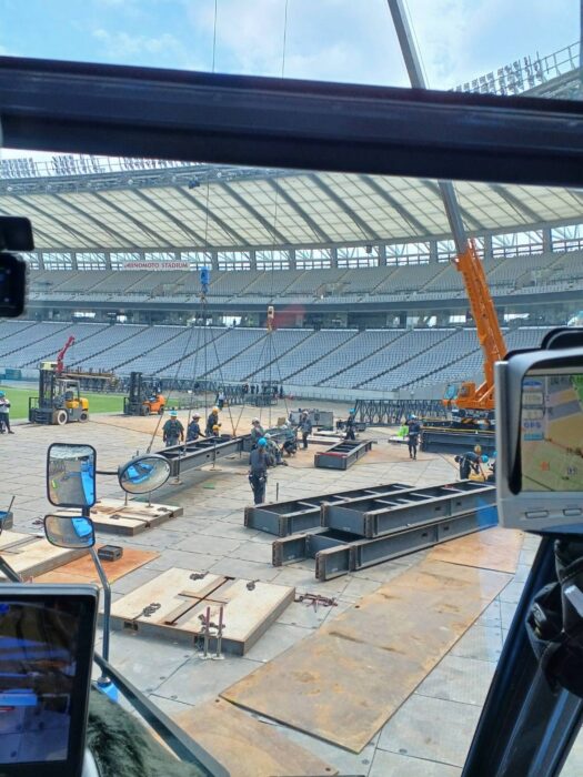 本日、スタジアム内にイベントステージ設営作業です。クレーン2台で作業行い無事終わる事が出来ました。