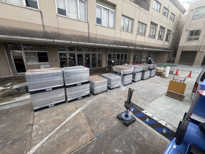 本日、インターロッキング搬入作業です。パレットは1.4トンありました。作業は順調に進んで無事終わる事が出来ました。
