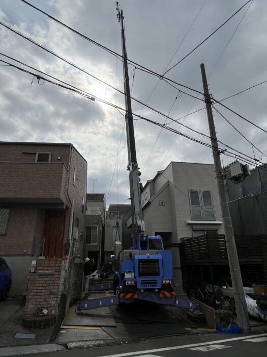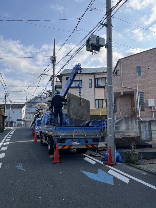 エコキュート揚重及び鉄板養生施工作業