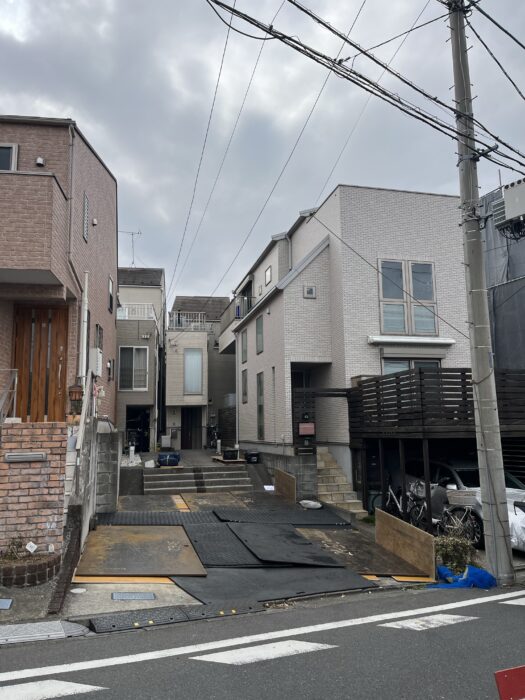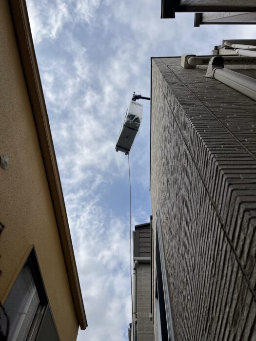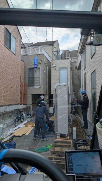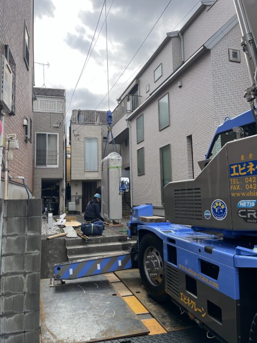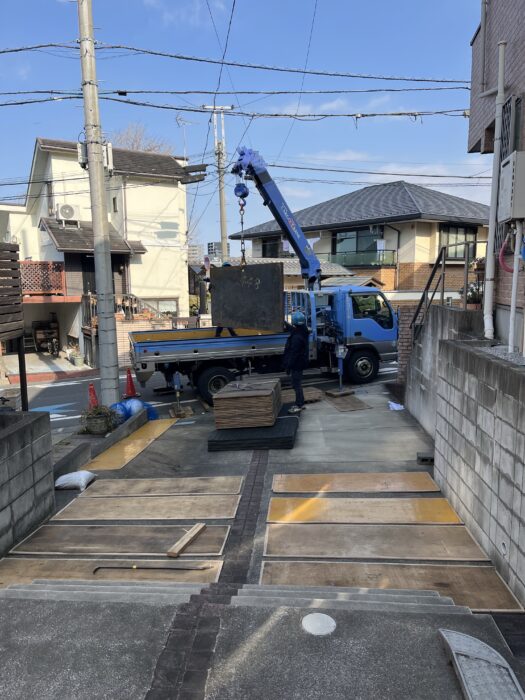2026年2月16日エコキュート揚重及び鉄板養生施工作業