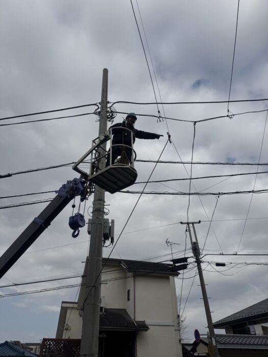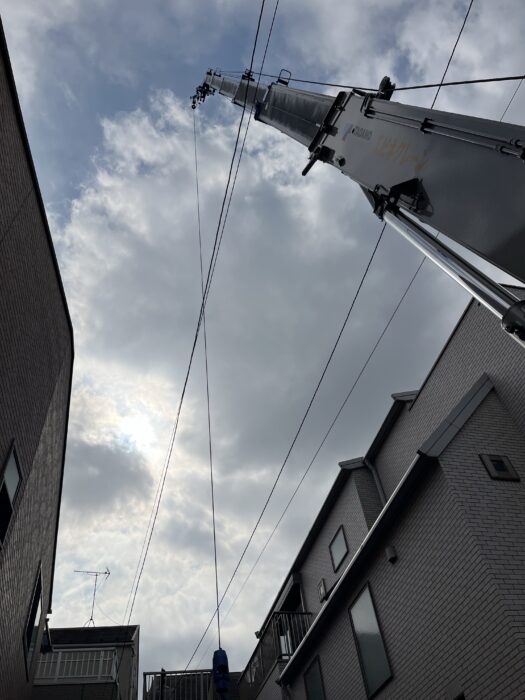 本日、エコキュート揚重作業です。弊社ユニック班が鉄板養生施工作業してからラフター13トン進入設置、上部電線があり作業がやりにくい為ユニックにゴンドラ取付して電線を引っ張ってやりやすいようにしました。作業は順調に進んで無事終わる事が出来ました。