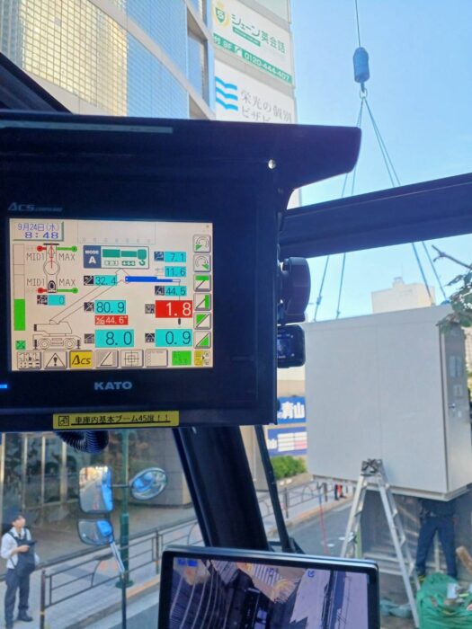 本日、引き続きの現場でキュービクル揚重作業です。キュービクルを分割して搬入致しました。作業は順調に進んで無事終わる事が出来ました。