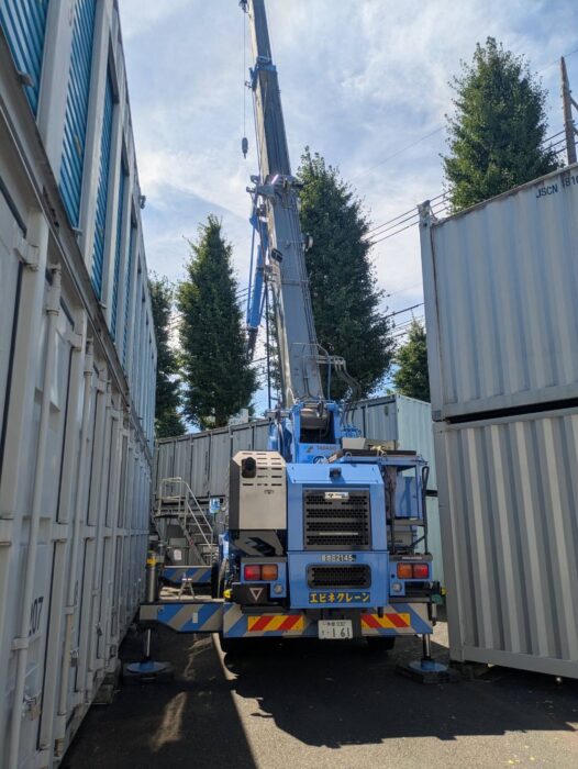 本日、コンテナ搬出作業です。始めは限られたスペースで作業行い、コンテナが無くなったらアウトリガーを張り出しして作業行いました。作業は順調に進んで無事終わる事が出来ました。