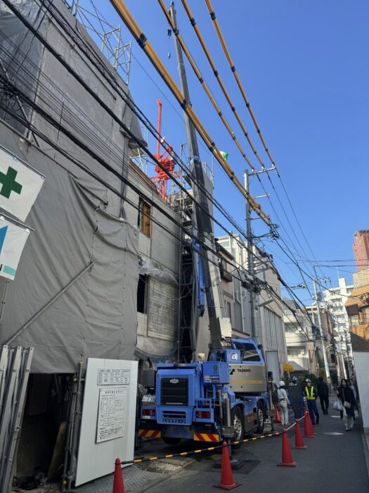 本日、タワークレーン移動作業です。かなり狭い現場でクレーン設置も大変でしたが、作業は順調に進んで無事終わる事が出来ました。