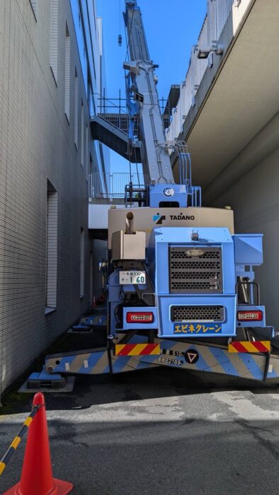 本日、ボード材搬入作業です。狭い場所での作業の為先にトラック進入、そのあとラフター16トン進入設置して作業行いました。作業は順調に進んで無事終わる事が出来ました。