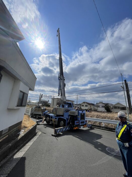 本日、ボーリングマシン揚重作業です。作業は順調に進んで無事終わる事が出来ました。