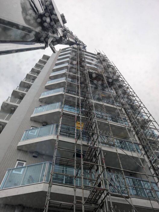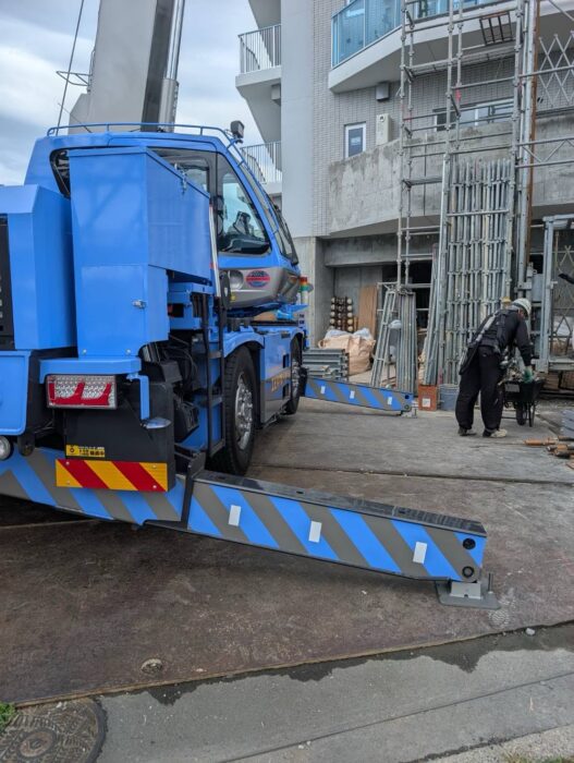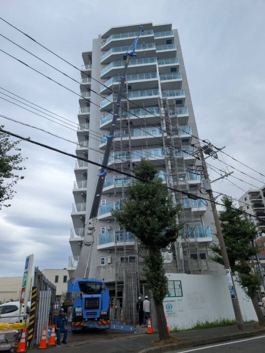 本日、足場エレベーターの解体作業です。ラフター13トンが取れる場所まで解体してもらい作業行いました。解体作業は順調に進んで無事終わる事が出来ました。