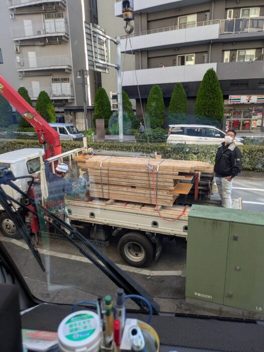 本日、型枠材搬入作業です。トラック1台分搬入致しました。作業は順調に進んで無事終わる事が出来ました。