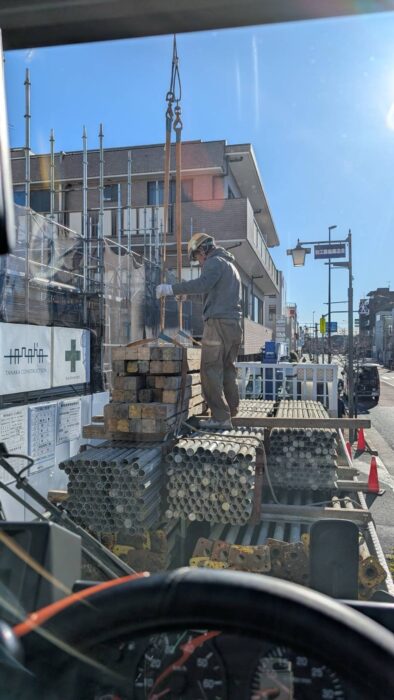 本日、引き続きの現場で型枠材搬入作業です。午前中トラック1台搬入、午後振分作業行いました。作業は順調に進んで無事終わる事が出来ました。