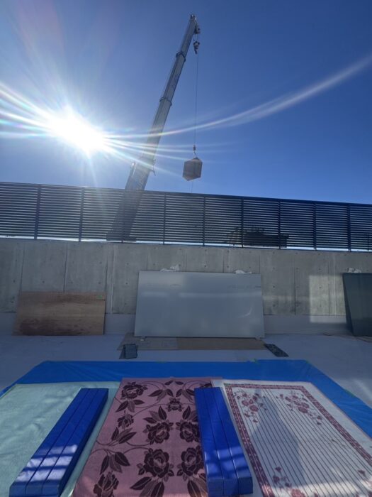 本日、運送屋さんと一緒の作業で家具搬入作業です。弊社作業員が上に上がり無線合図、下で玉掛け作業行い家具6点搬入致しました。作業は順調に進んで無事終わる事が出来ました。