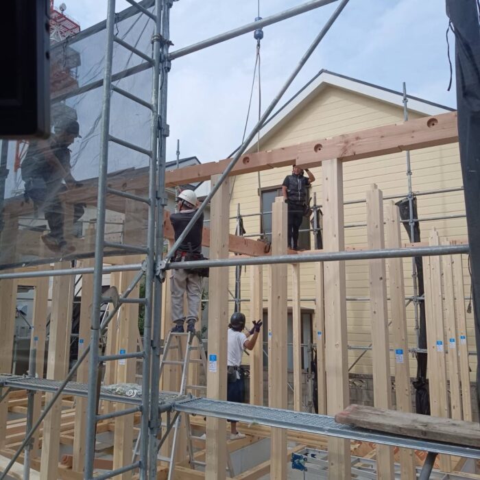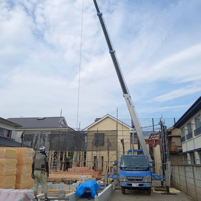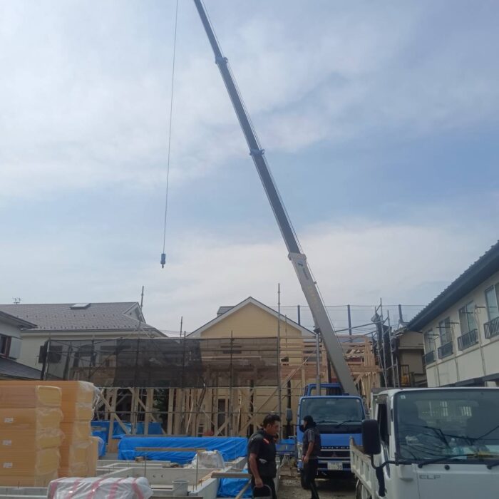 本日、木造建て方作業です。平屋でやりやすく、作業は順調に進んで無事終わることができました。