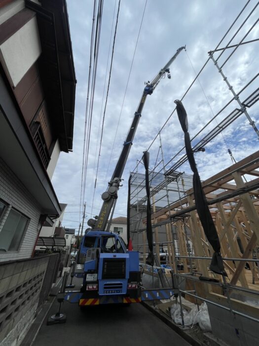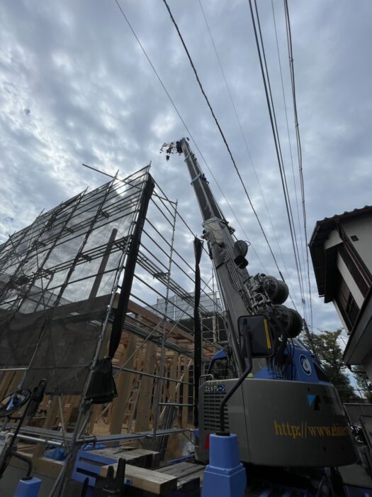 本日、木造建て方作業です。足場や電線がありピタゴラスの出番になりました。作業は順調に進んで無事終わる事が出来ました。