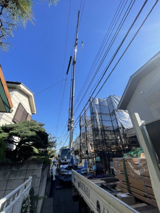 本日、木造建て方作業です。やりにくい現場で電線もありピタゴラスの出番になりました。建て方作業は順調に進んで無事終わる事が出来ました。