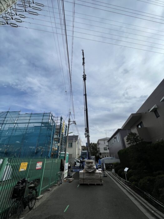 本日、木造建て方作業です。送電線の下での作業で揚程を気にしながらの作業行いました。作業は順調に進んで無事終わる事が出来ました。