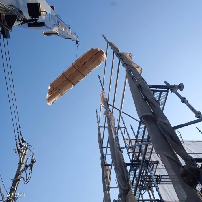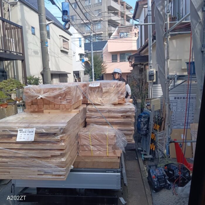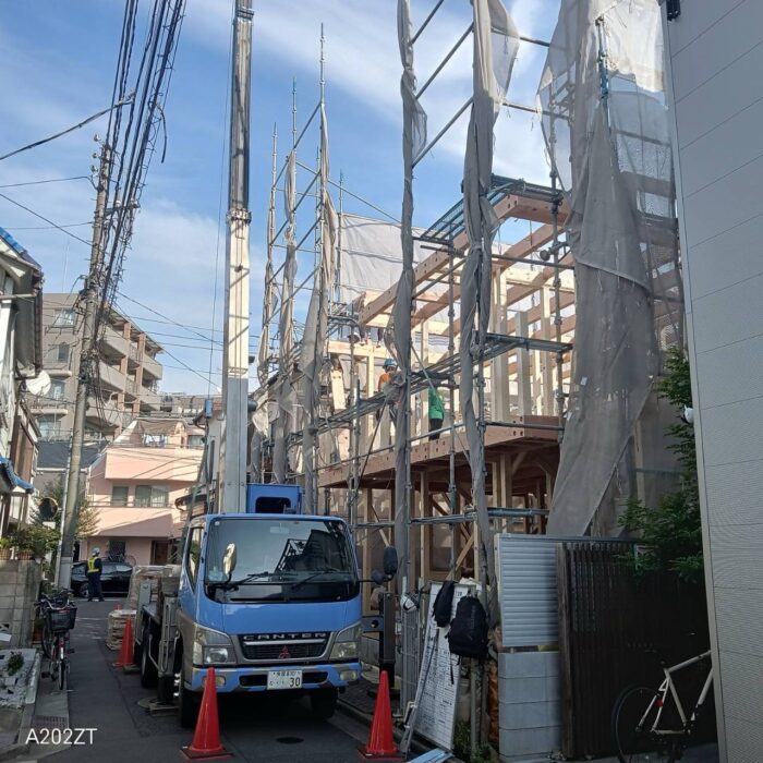 本日、木造建て方作業です。やりにくい現場で建て方は大変でしたが、作業は順調に進んで無事終わる事が出来ました。