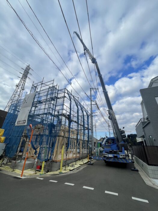 本日、木造建て方作業です。高圧線越しの為ピタゴラスの出番になりました。建て方は順調に進んで無事終わる事が出来ました。