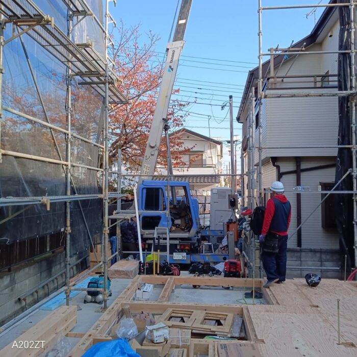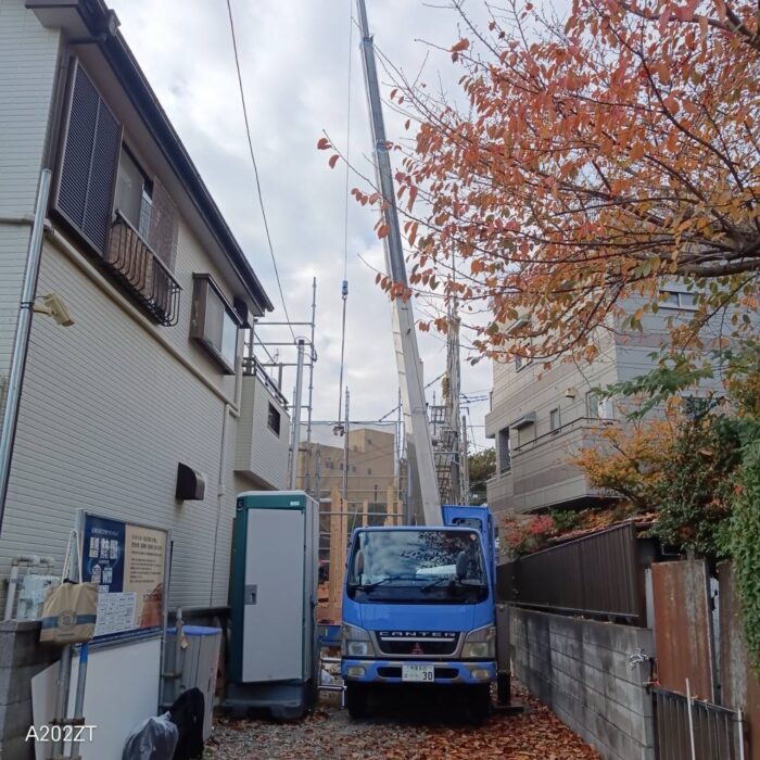 本日、木造建て方作業です。狭く大変な現場で木造建て方作業です。建て方作業は順調に進んで無事終わる事が出来ました。