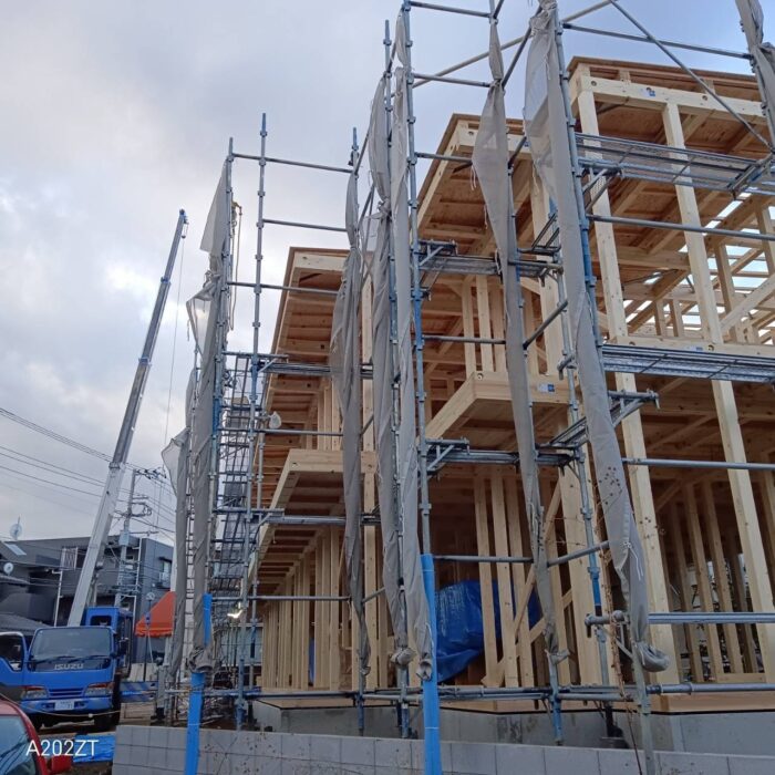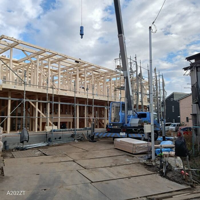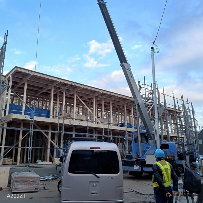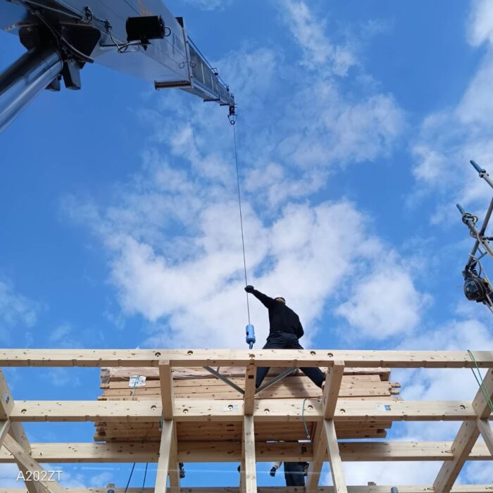 本日、昨日に引き続きの現場で木造建て方作業です。建て方作業は順調に進んで無事終わる事が出来ました。