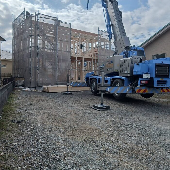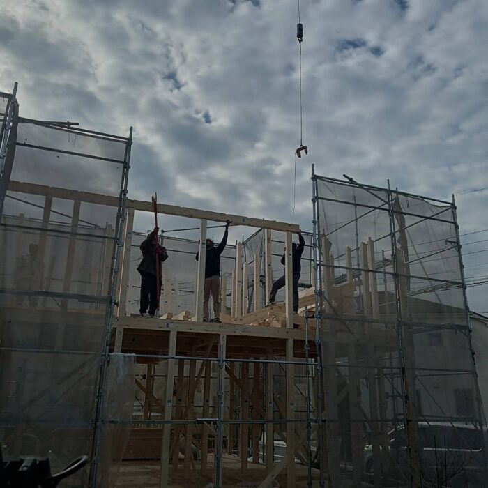 本日、木造建て方作業です。建て方作業は順調に進んで無事終わる事が出来ました。