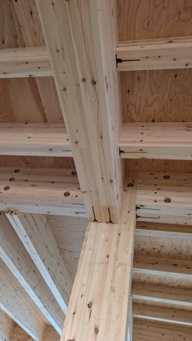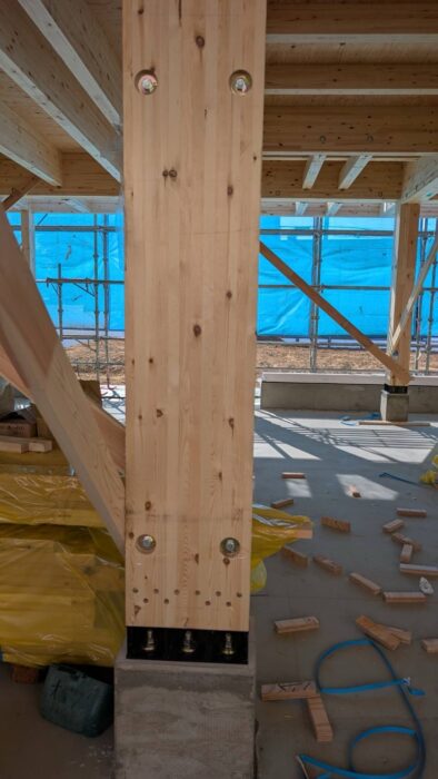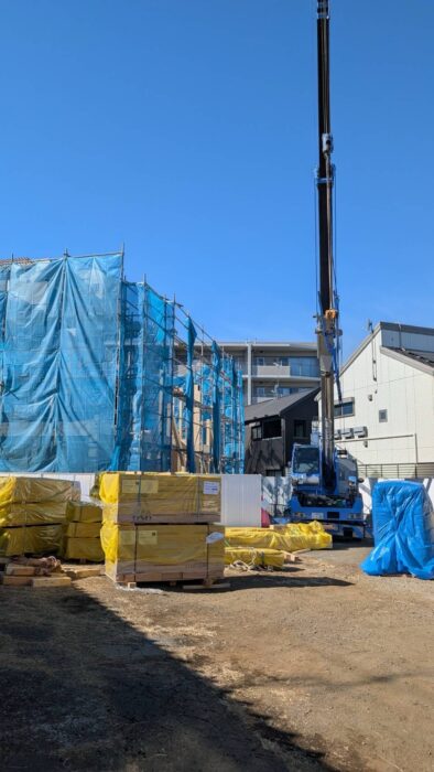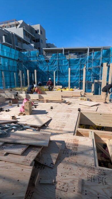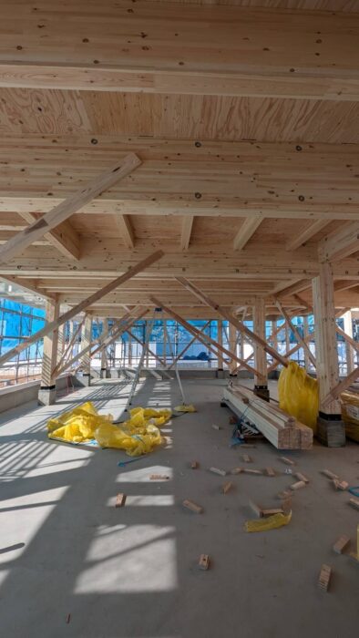 本日、昨日に引き続き木造建て方作業です。今日は2階部分の建て方作業行いました。建物が大きくピン工法の為大変でした。明日母屋組作業です。