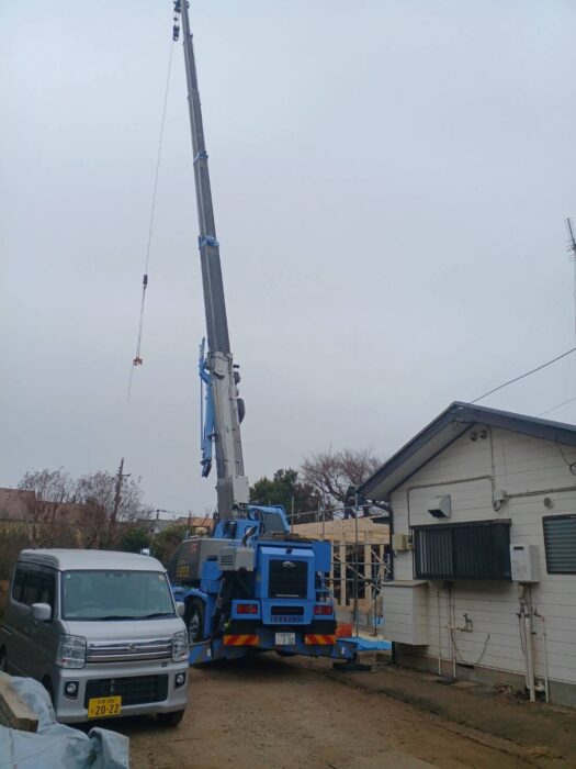 本日、木造建て方作業です。作業は順調に進んで無事終わる事が出来ました。