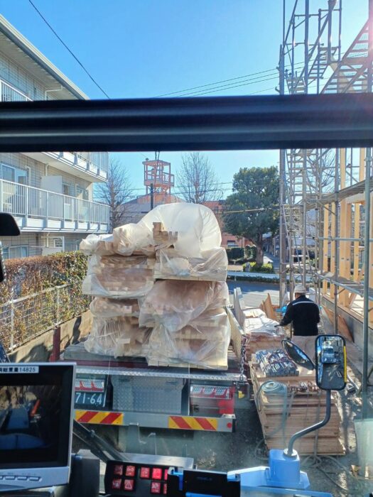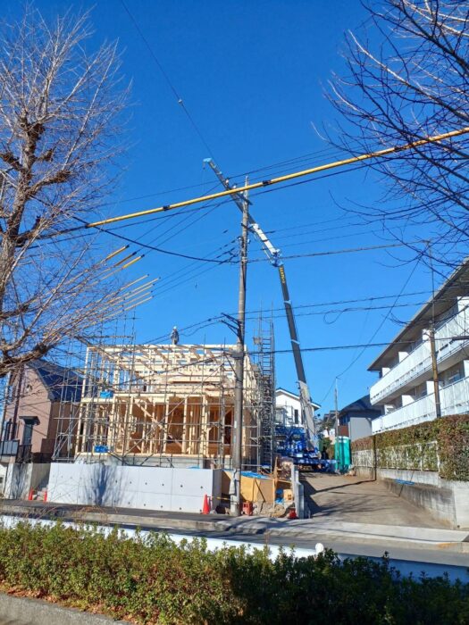 本日、木造建て方作業です。建て方作業は順調に進んで無事終わる事が出来ました。