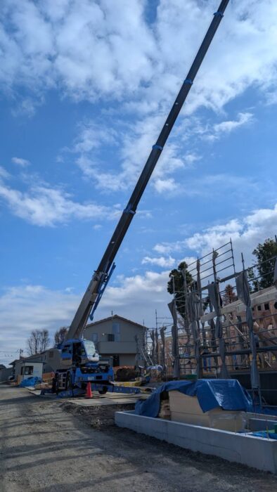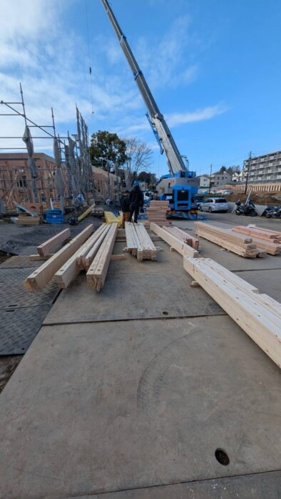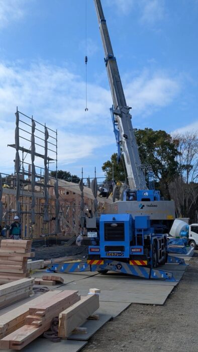 本日、木造建て方作業です。大きい建物でラフター16トンで作業行いました。2日に分けて建て方作業行い、今日は無事梁付けまで出来ました。明日は登り梁の取付作業です。