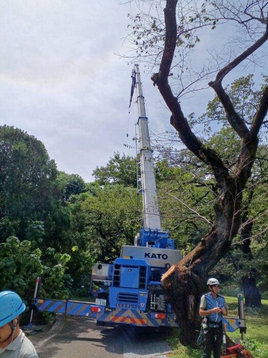 本日、枯れ枝剪定作業です。軟弱な場所にラフター35トン進入設置して作業行いました。作業は順調に進んで無事終わる事が出来ました。