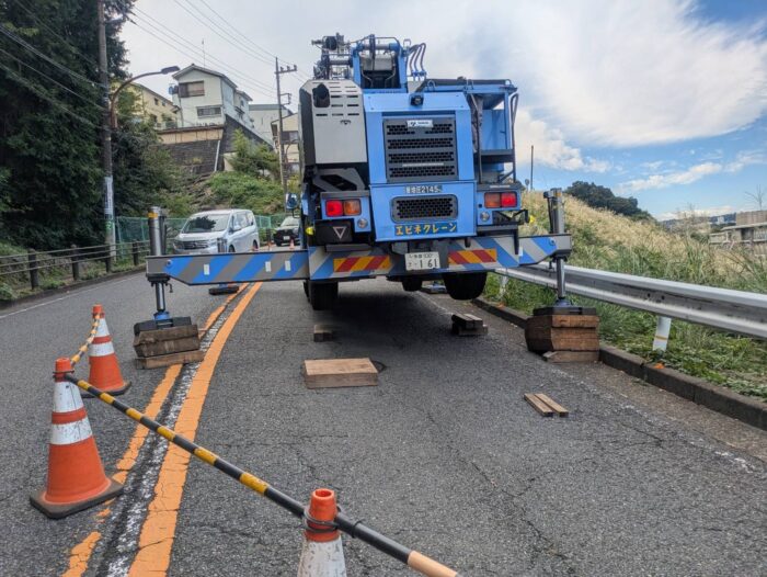 本日、枯木伐採作業です。勾配地でクレーン設置が大変でした。伐採作業は順調に進んで無事終わる事が出来ました。