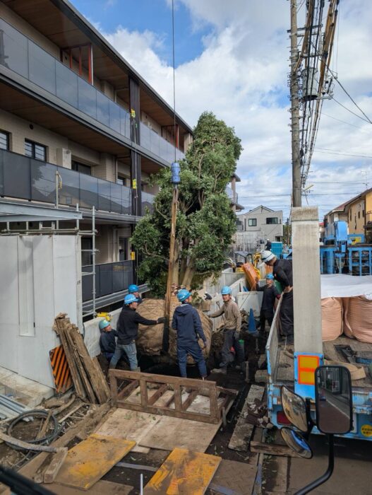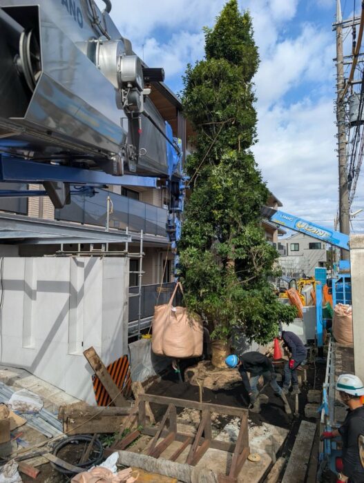 本日、植木搬入作業です。電線の下から伸縮作業行いながら搬入致しました。作業は順調に進んで無事終わる事が出来ました。