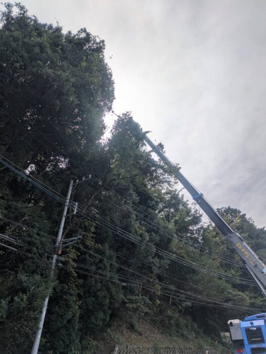 本日、樹木伐採作業です。斜面地でバタ角で水平にしてから作業開始致しました。伐採作業は順調に進んで無事終わる事が出来ました。