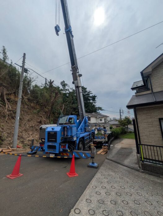 本日、引き続きの現場で樹木剪定作業です。勾配がかなりきつい場所で水平取るのが大変でした。クレーン設置後対象木3本の剪定作業することができました。作業は順調に進んで無事終わることができました。