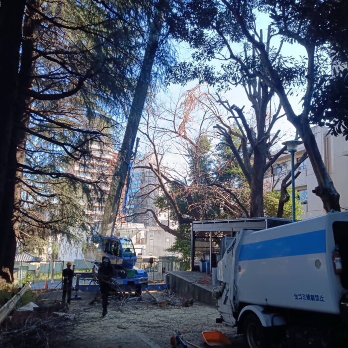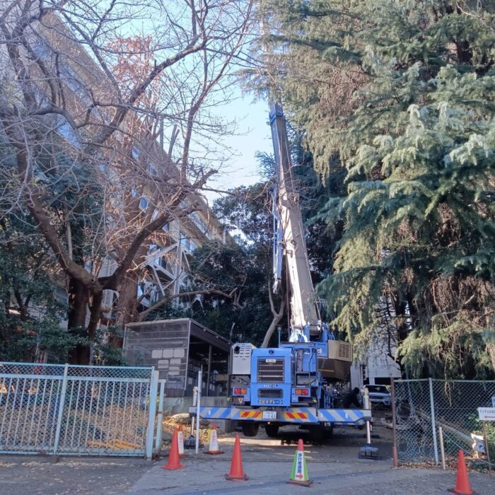 本日、昨日に引き続き樹木剪定作業です。朝残りの剪定作業行い、クレーン設置替えしてイチョウの剪定作業行いました。作業は順調に進んで無事終わる事が出来ました。