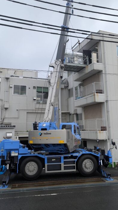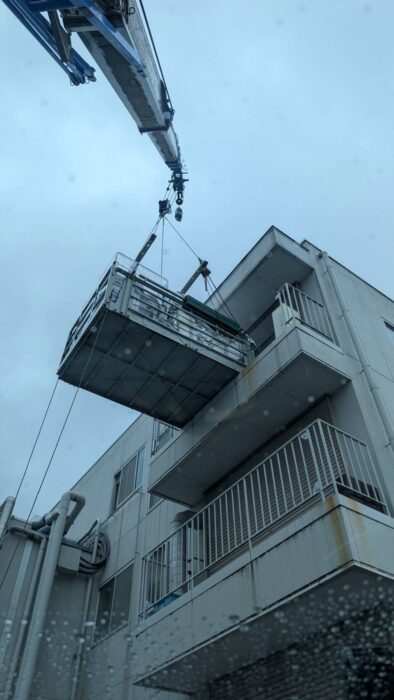 本日、重量屋さんと一緒の作業で機械揚重作業です。ゴンドラに機械を入れて4階搬入口に搬入致しました。作業は順調に進んで無事終わる事が出来ました。