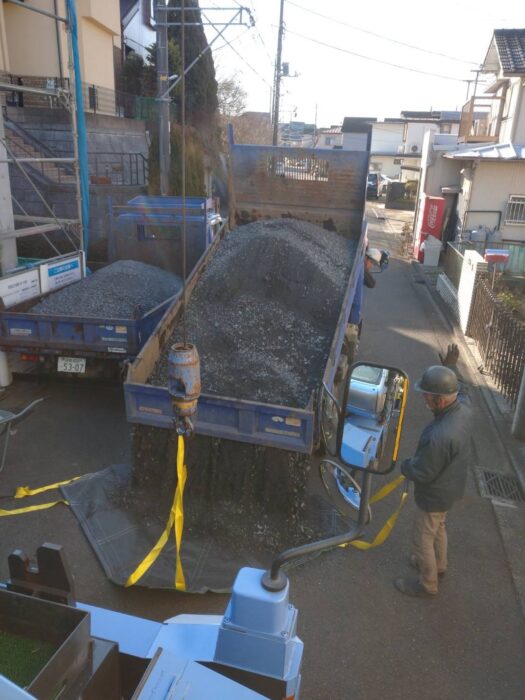 本日、砕石搬入作業です。午前中トラック5台、午後2台搬入致しました。作業は順調に進んで無事終わる事が出来ました。
