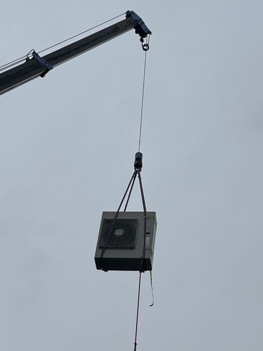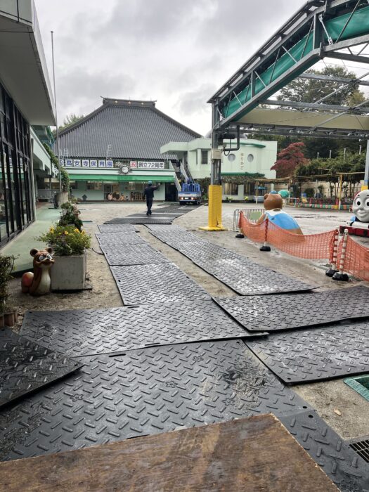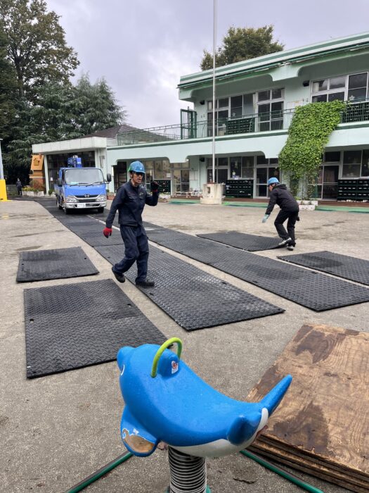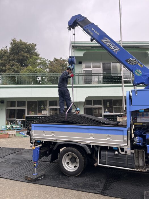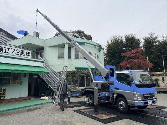 本日、保育園の中で空調室外機交換作業です。園庭内にクレーン作業の為弊社ユニック班が養生施工してからトラッククレーン設置して作業行いました。作業は順調に進んで無事終わる事が出来ました。