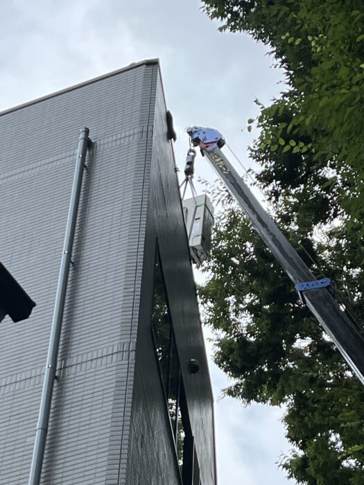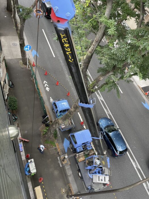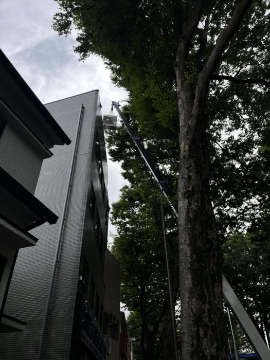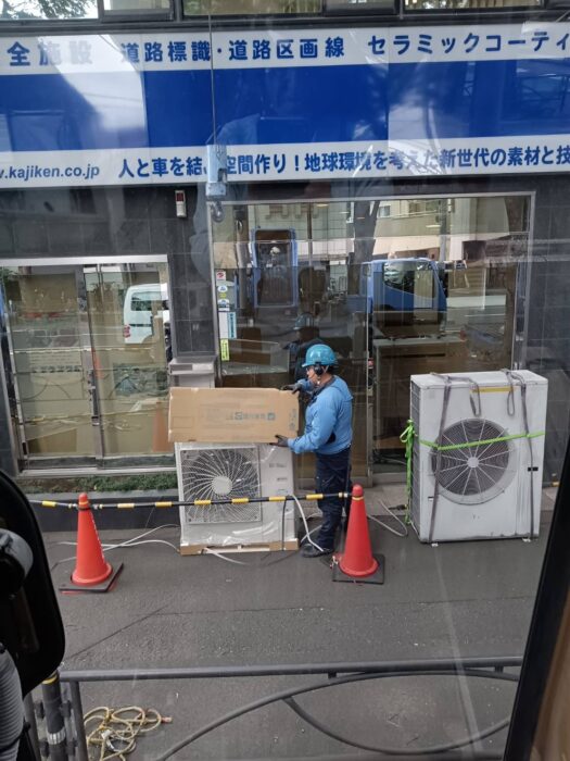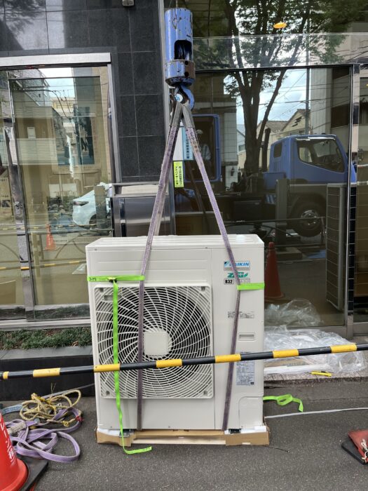 本日、空調室外機揚重作業です。国道の場所で空調室外機揚重作業行いました。弊社玉掛け作業員が屋上と下でしっかり玉掛け作業行い無事終わる事が出来ました。