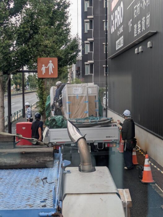 本日、空調室外機揚重作業です。8個搬入致しました。作業は順調に進んで無事終わる事が出来ました。