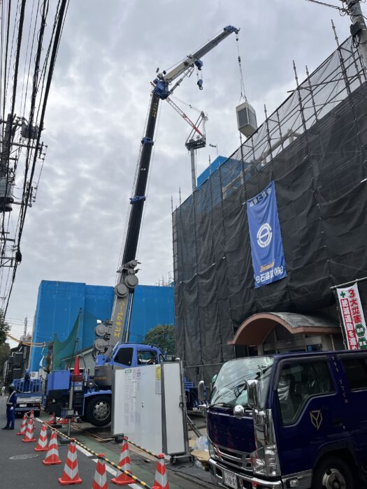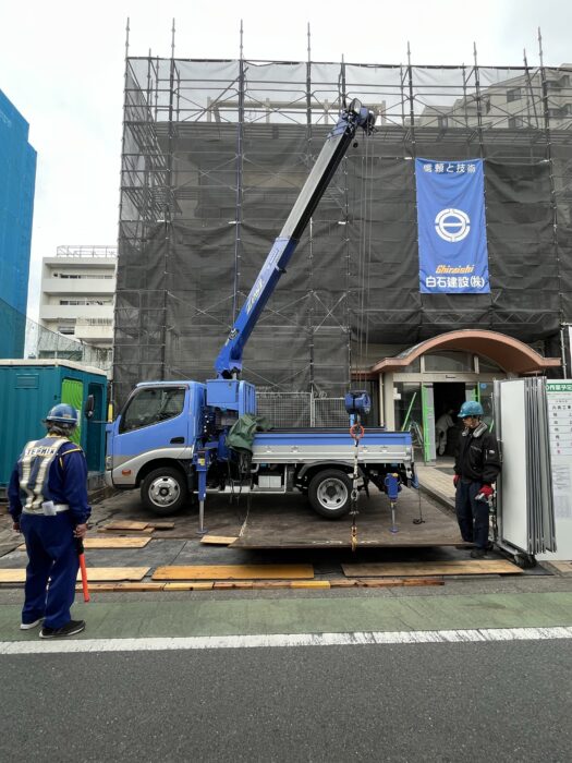 本日、前日作業した場所で空調室外機揚重作業です。弊社ユニック班が養生施工した後ピタゴラス進入設置して作業行いました。作業は順調に進んで無事終わる事が出来ました。