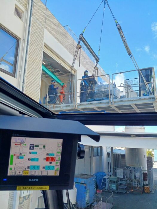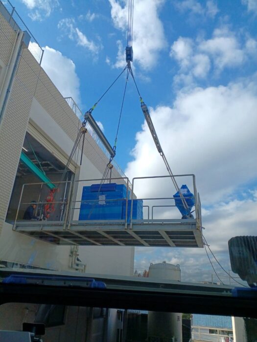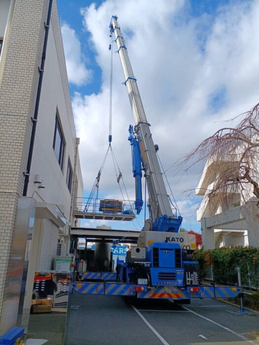 本日、精密機械搬入作業です。ゴンドラに機械入れて2階部分に搬入致しました。作業は順調に進んで無事終わる事が出来ました。