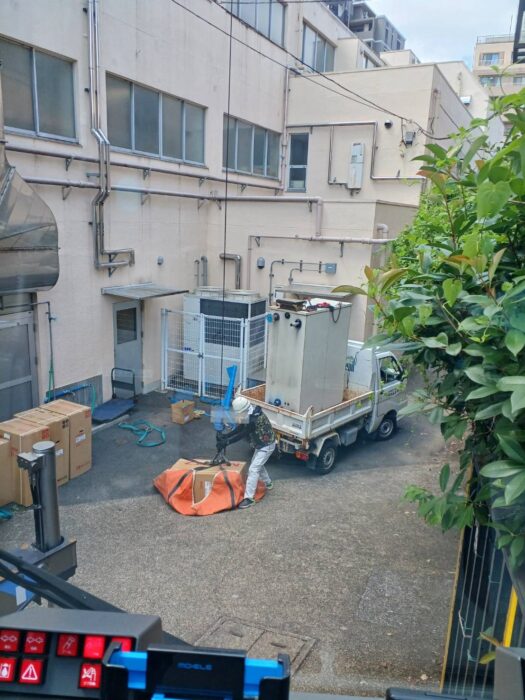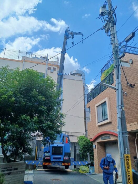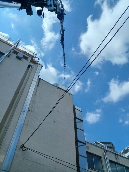 本日、学校の屋上にある給湯器を入替作業です。お客様に弊社置場にて養生材を積んで持って来て頂きクレーン進入前に養生施工してクレーン進入設置。ピタゴラスで作業行いました。作業は順調に進んで無事終わる事が出来ました。