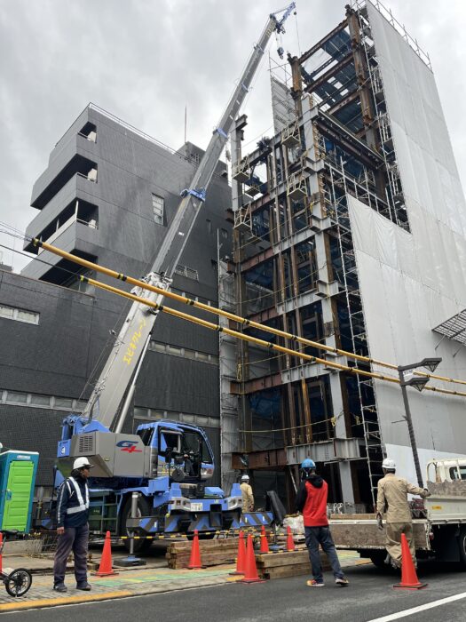 本日、足場材搬入作業です。弊社作業員が現場内の鉄板を移動作業行いました。午前中に足場材搬入して無事終わる事が出来ました。