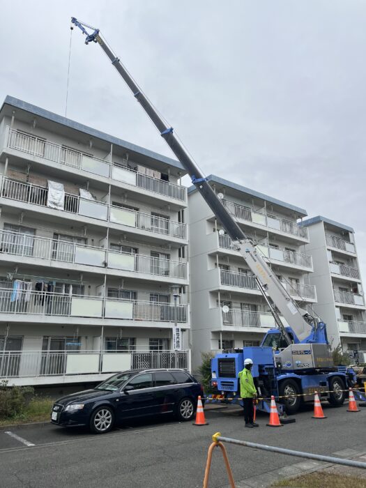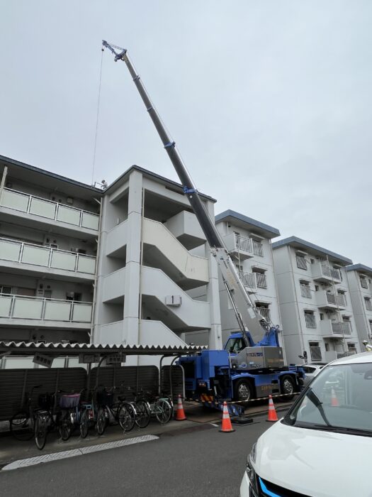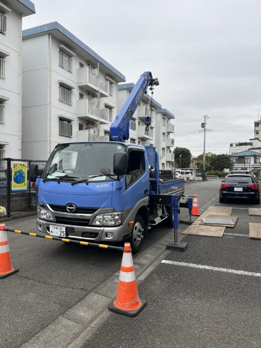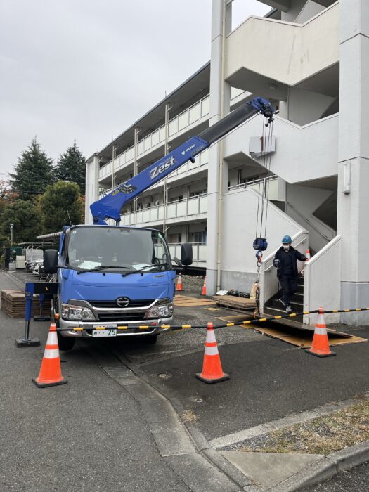 本日、団地屋上防水工事で足場材搬入作業です。弊社ユニック班が各棟の養生施工作業した後、ラフター進入設置2棟分の足場材搬入致しました。作業は順調に進んで無事終わる事が出来ました。