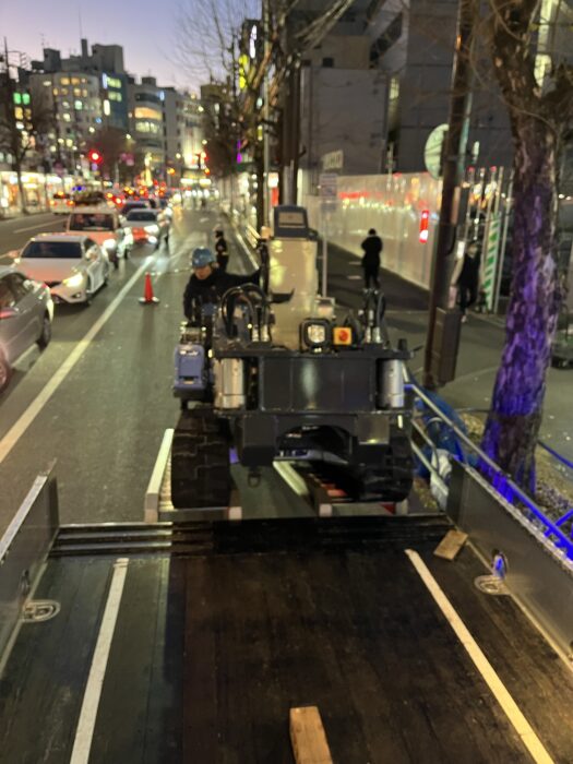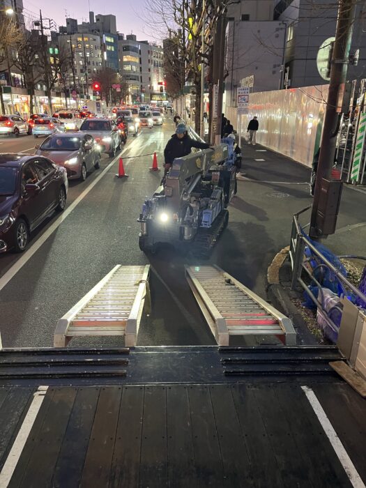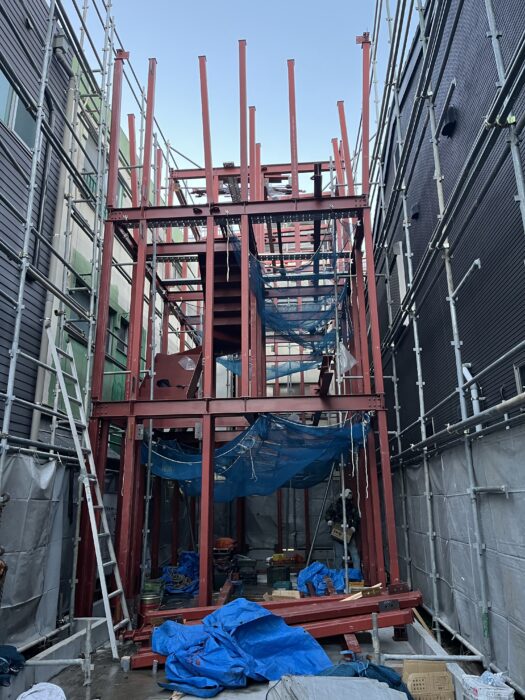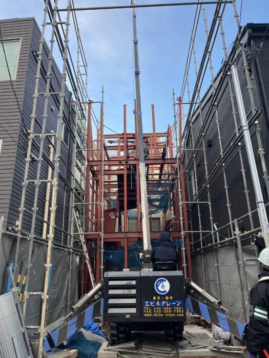 本日、昨日に引き続きの現場で軽量鉄骨建て方作業です。カニクレーンをセット替えして作業行いました。無事2工区は終わる事が出来ました。明日は道路からトラッククレーンで作業です。