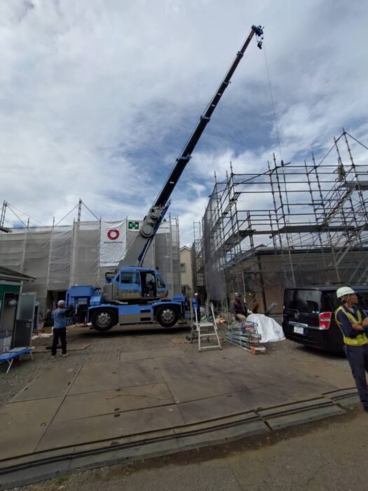 本日、軽量鉄骨建て方作業です。今日は一階部分の建て方作業でトラック3台分搬入建て方作業行いました。作業は順調に進んで無事終わる事が出来ました。明日も引き続き建て方作業です。