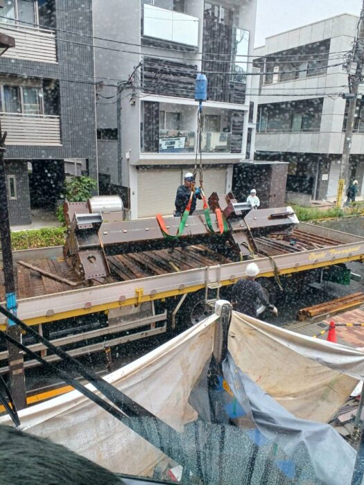 本日、引き続きの現場で重量鉄骨建て方作業です。Laughter 35トンで孫出しして、柱2.3トンの重さを定格ギリギリで搬入いたしました。建て方作業は順調に進んで無事終わる事が出来ました。