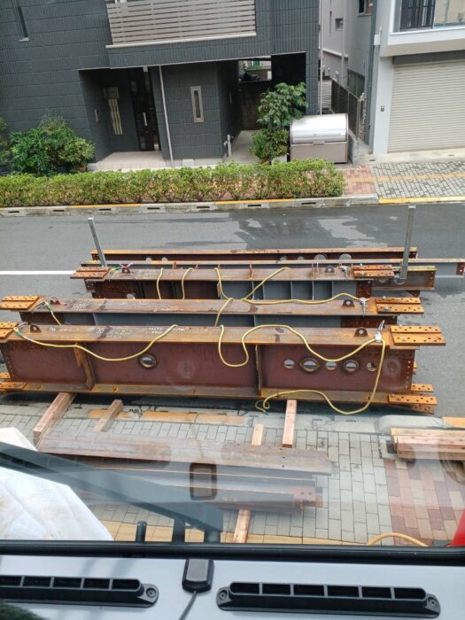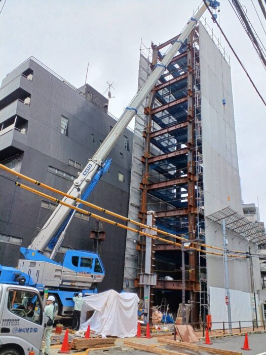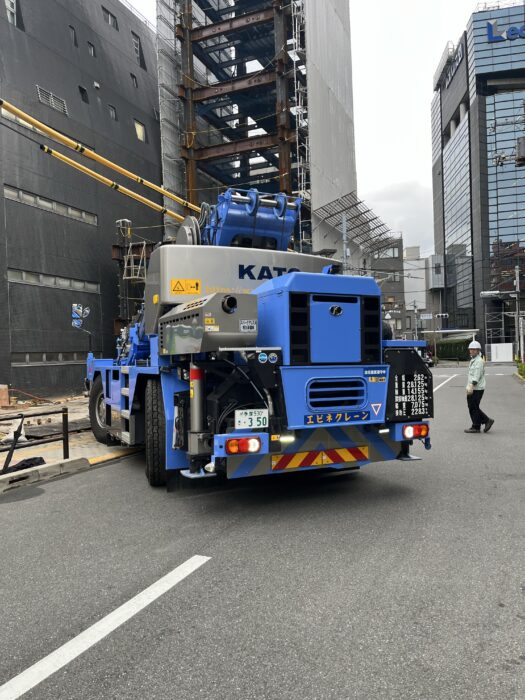 本日、引き続きの現場で重量鉄骨建て方作業です。2階から3階部分の建て方作業行いました。今日はラフターを出すことになりましたので弊社誘導員でしっかり誘導して無事搬出致しました。作業は順調に進んで無事終わる事が出来ました。