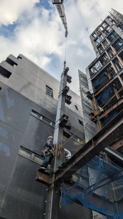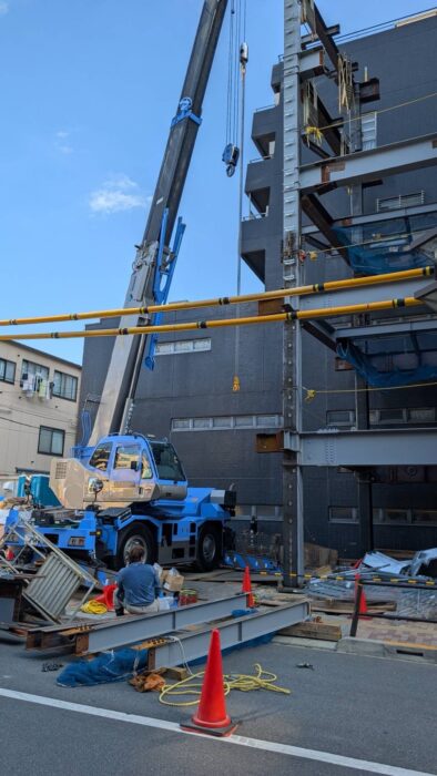 本日、引き続きの現場で重量鉄骨建て方作業です。今日は3から5階部分の建て方作業行いました。建て方作業は順調に進んで無事終わる事が出来ました。