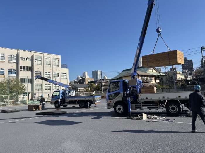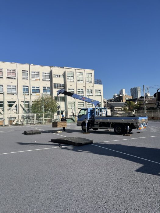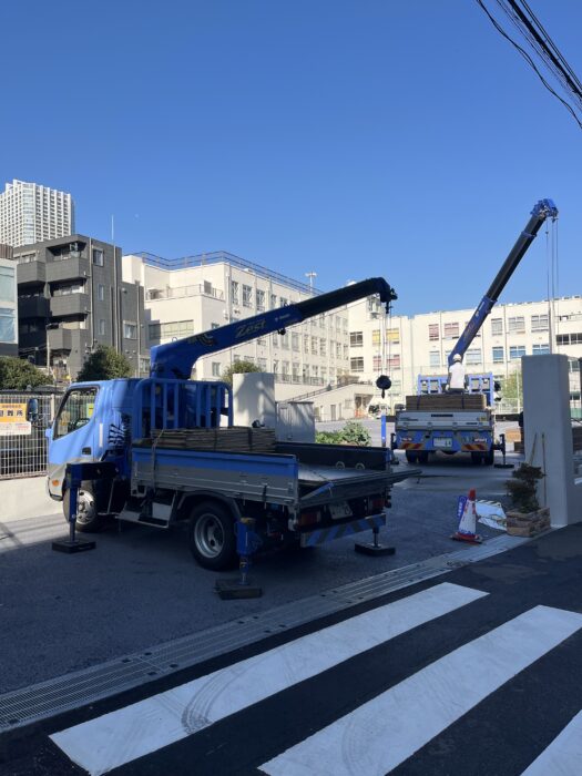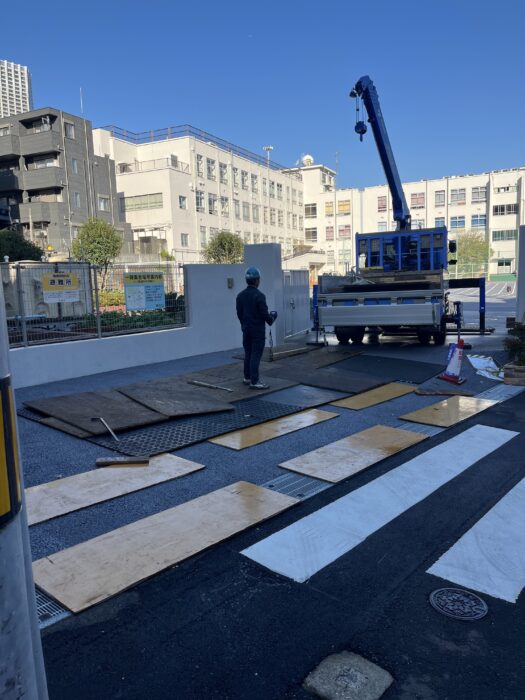 本日、養生撤去作業です。弊社ユニック班がプラシキと厚ベニヤ材と敷鉄板を回収致しました。作業は順調に進んで無事終わる事が出来ました。